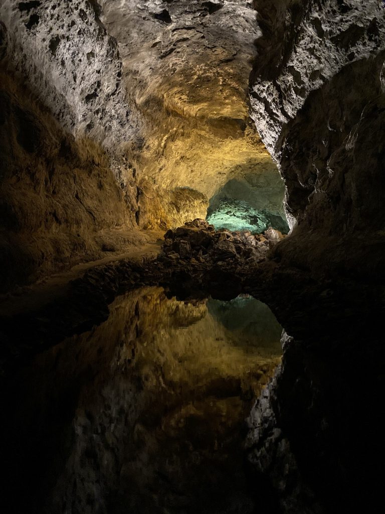 Con el estomago lleno bajamos ahora por nuestros pasos para retomar la visita de la Cueva de los Verdes. En este momento la afluencia de público es mucho más reducida y solo tenemos que esperar unos minutos para dejarnos guiar por un tubo volcánico de recorrido total unos 7 km, del que completaremos 1 km. En este recorrido podemos ver las estratificaciones del flujo de lava que fluyó hace unos 20.000 años y llegamos hasta un magnífico auditorio con una acústica excepcional debido a su composición de basalto, mineral poroso que absorbe el sonido. No cuentan que se celebran varios conciertos al mes. Podemos contemplar también el secreto mejor guardado de la cueva, que nos dejó estupefactos.