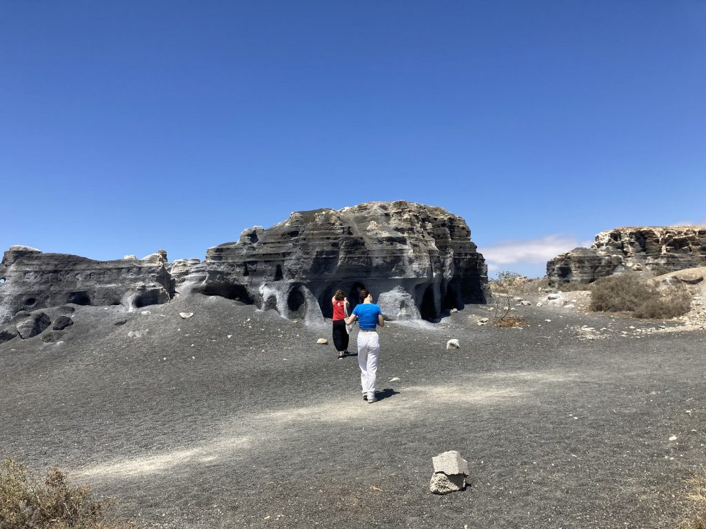 A continuación decidimos dirigirnos a la «Ciudad estratificada- Rofera Teseguite» en la carretera que va de Guatiza a Teseguite, la LZ 404, donde disfrutamos de formas sinuosas, imposibles y propias de una vida en otros planeta, producto de la erosión natural y de la utilización del rofe o arena volcánica que los agricultores utilizan para los cultivos como forma de protegerlos del sol y retener la humedad atmosférica. Es un paisaje auténticamente lunar.